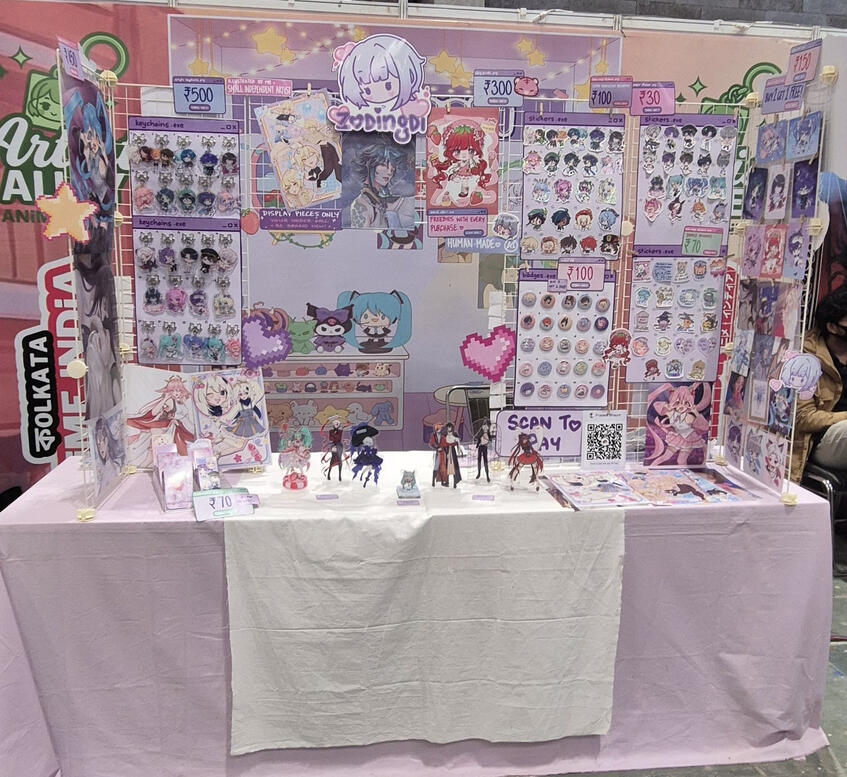 Hello! I'm Lala (zodingdi) and I've been actively exhibiting in artist alleys all over India since 2025! I exclusively feature 100% self-made artworks - both original illustrations and fanart of different anime, games, etc.here's some info about my work exhibited at fests, cons and artist alleys: