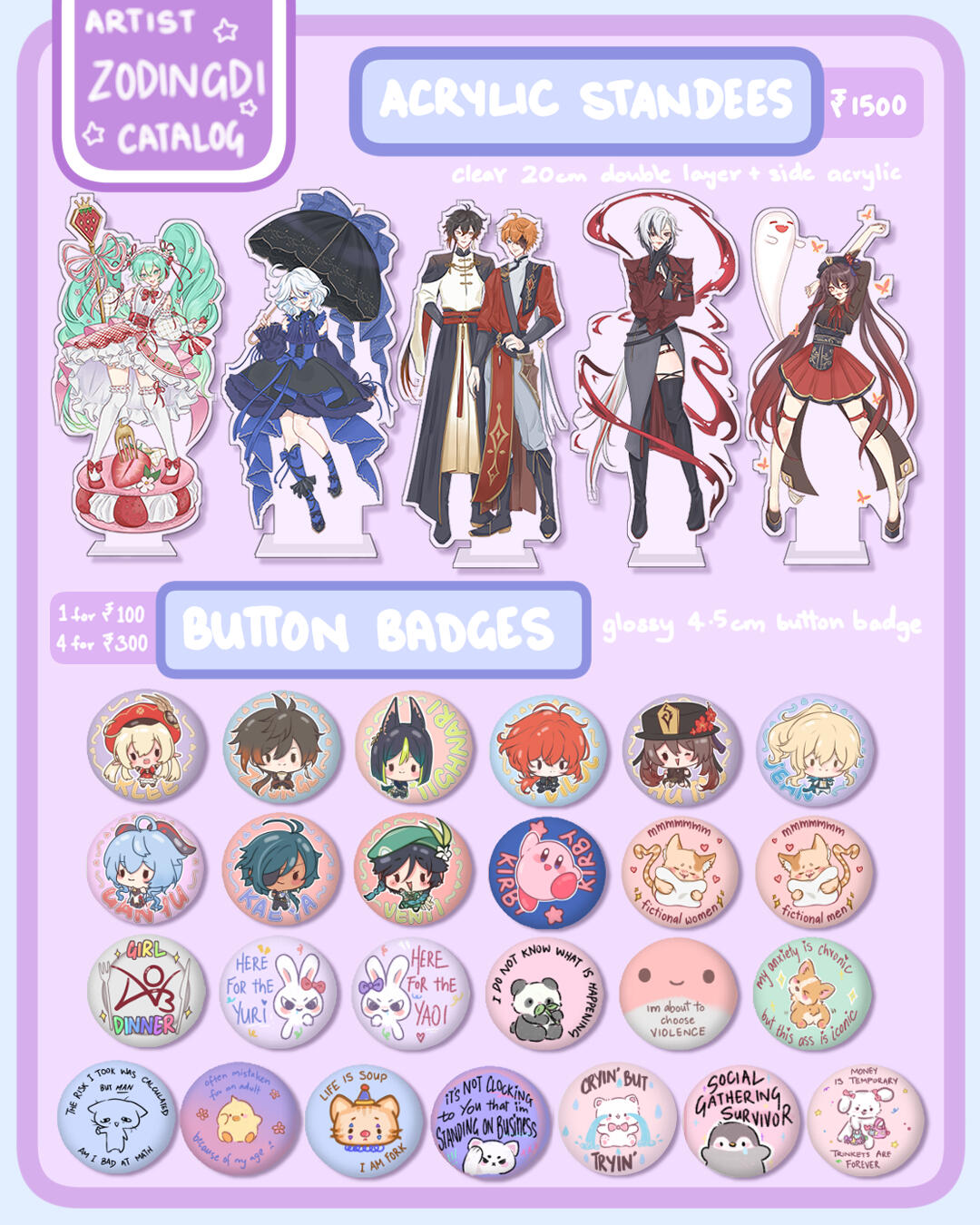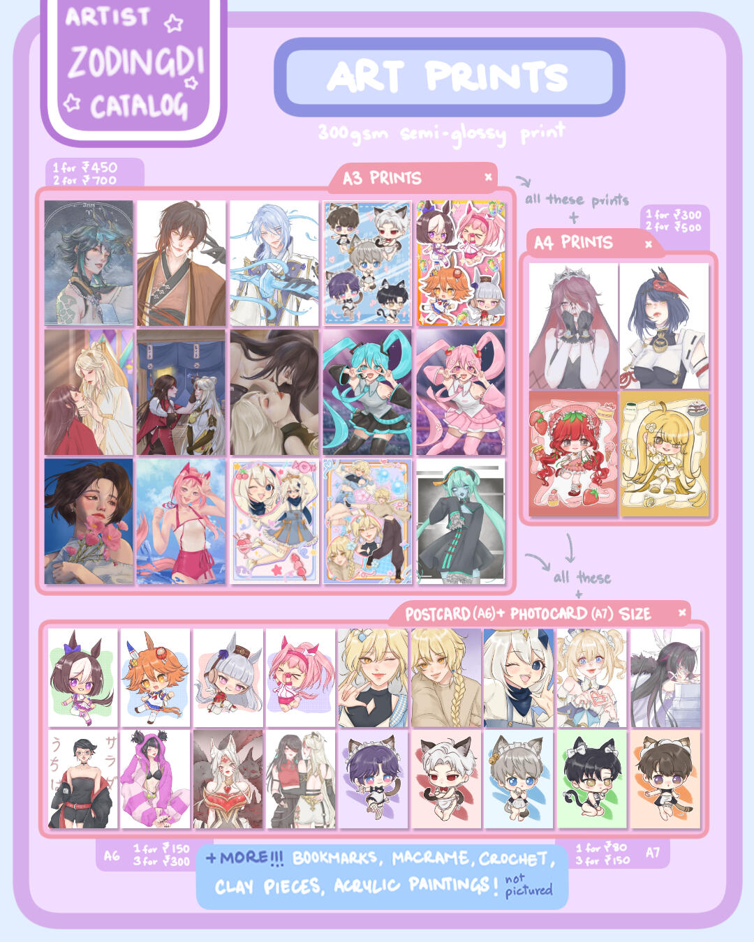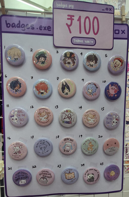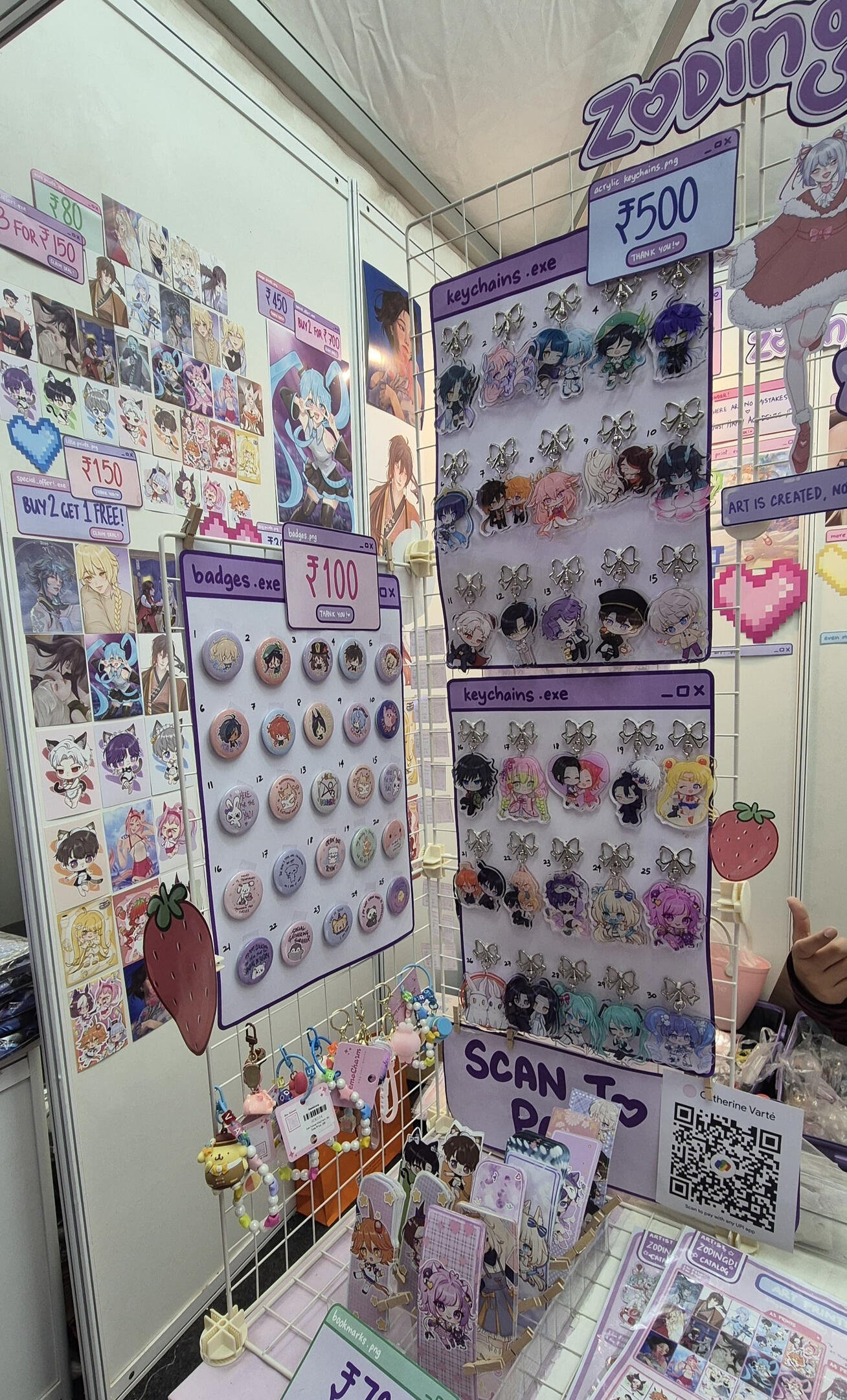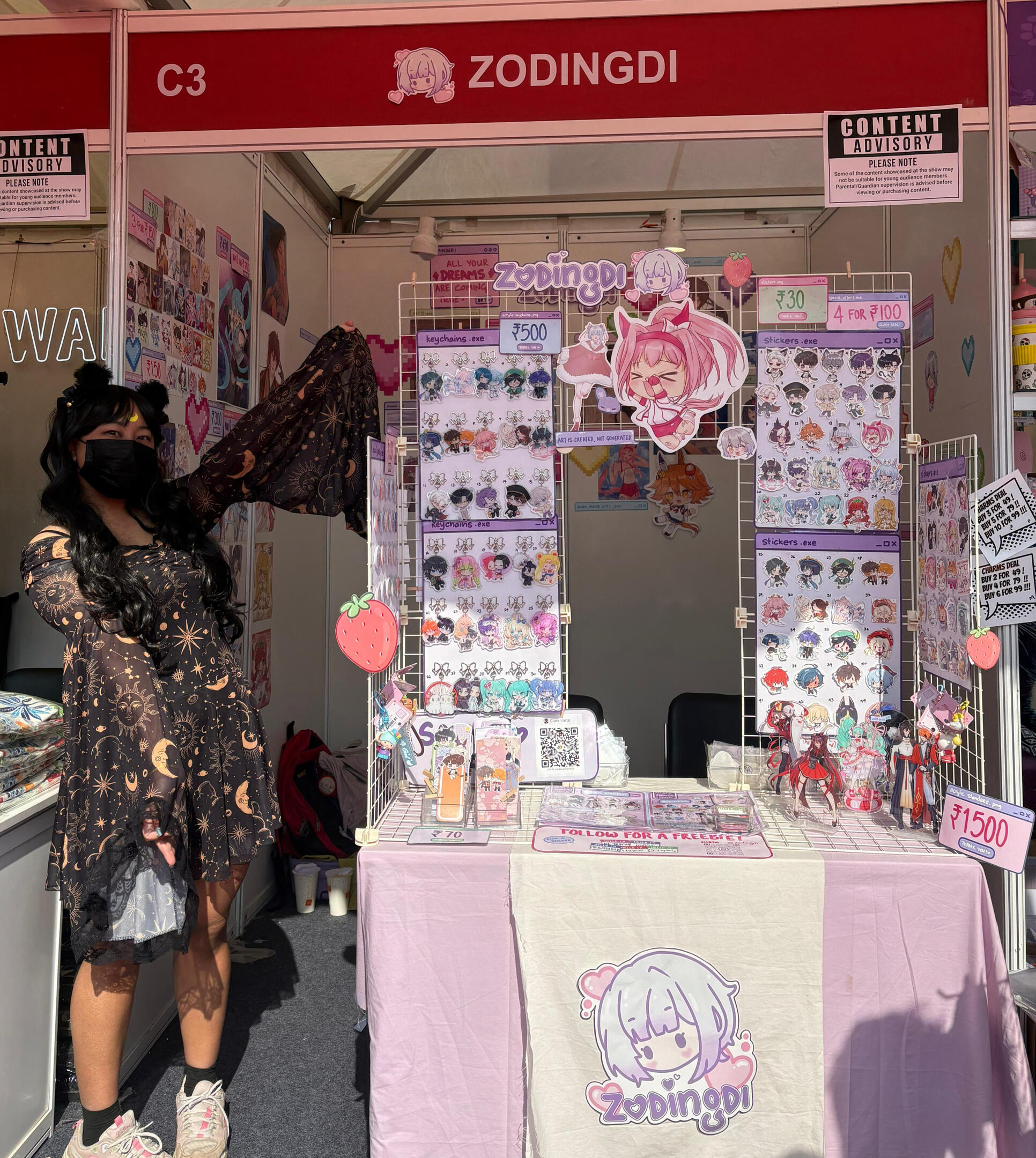 Hello! I'm Lala (zodingdi) and I've been actively exhibiting in artist alleys all over India since 2025! I exclusively feature 100% self-made artworks - both original illustrations and fanart of different anime, games, etc.here's some info about my work exhibited at fests, cons and artist alleys: